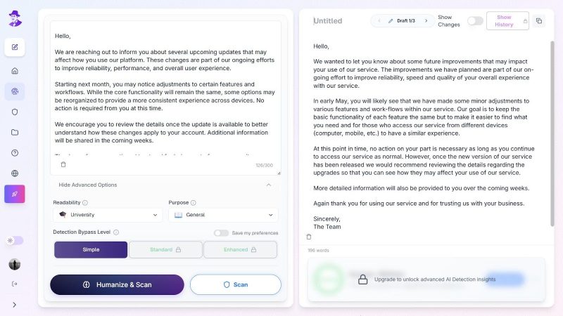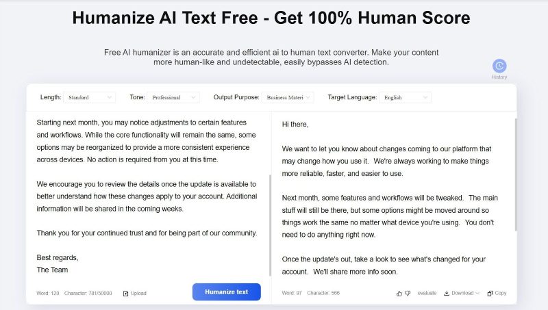The humanizer rewrites text to sound more natural while keeping sentence logic intact, which makes it suitable for academic and professional writing.