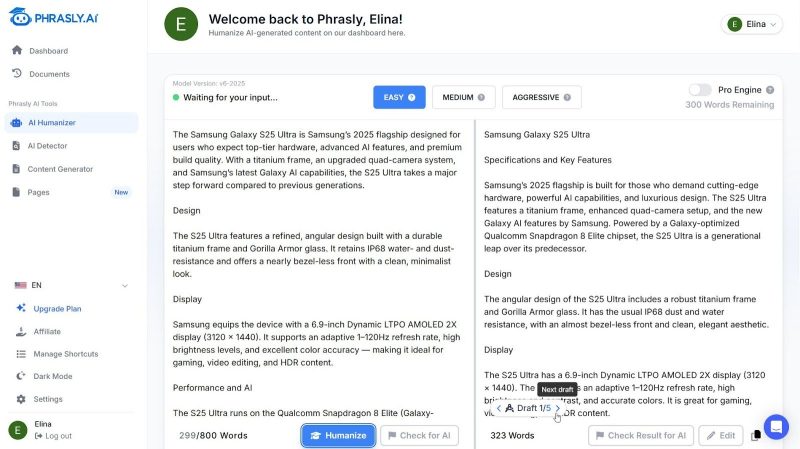 In our dataset, Phrasly delivered a very clean language with an average grammar score of 97.0, but its rewriting style stayed close to the original structure, which makes it more suitable for refinement than transformation. However, its structural changes stayed limited, which led to AI detection levels in the 85–92% range.