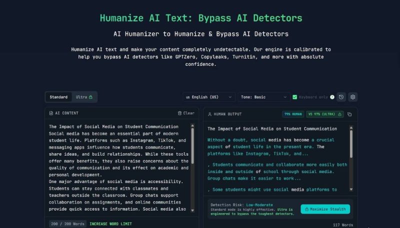 Undetectable AI Humanizer operates as a combined rewriting and analysis tool. It allows users to process text in batches and review rewriting strength. Word limits vary by plan, with monthly caps clearly enforced. The tool emphasizes restructuring rather than light paraphrasing, which can alter sentence rhythm noticeably.